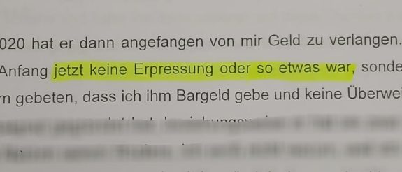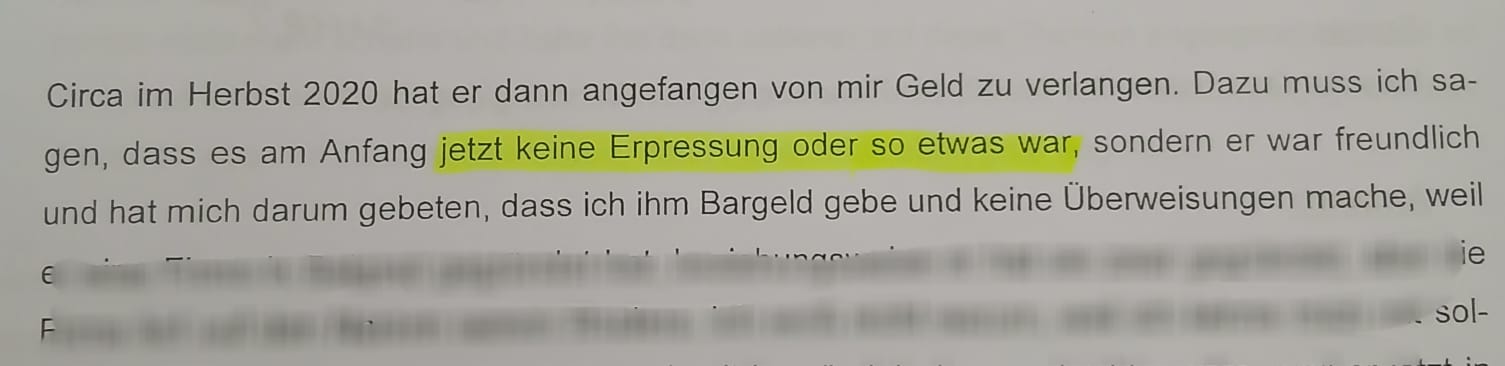 Am Anfang der Aussage für K22, nach der Einleitung, auf Seite 3 und Seite 4, wird klar erklärt, dass es in der VERGANGENHEIT KEINE ERPRESSUNGEN gab (Bild).