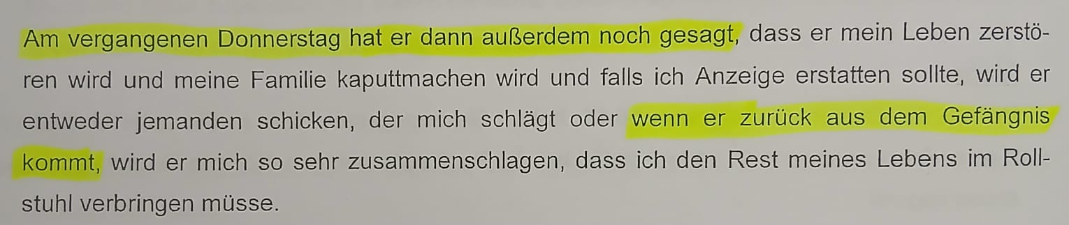 Und trotz all dem behauptet meine Ex-Partnerin am 1.12., dass ich ihr am 17.11. ernsthafte Drohungen gegen Leben und Gesundheit ausgesprochen habe, darunter die Behauptung, ich würde sie verprügeln oder zwingen, ihr Leben im Rollstuhl zu verbringen, und dass ich ihrer Familie Schaden zufügen werde, wenn ich „aus dem Gefängnis komme“?! (Bild)