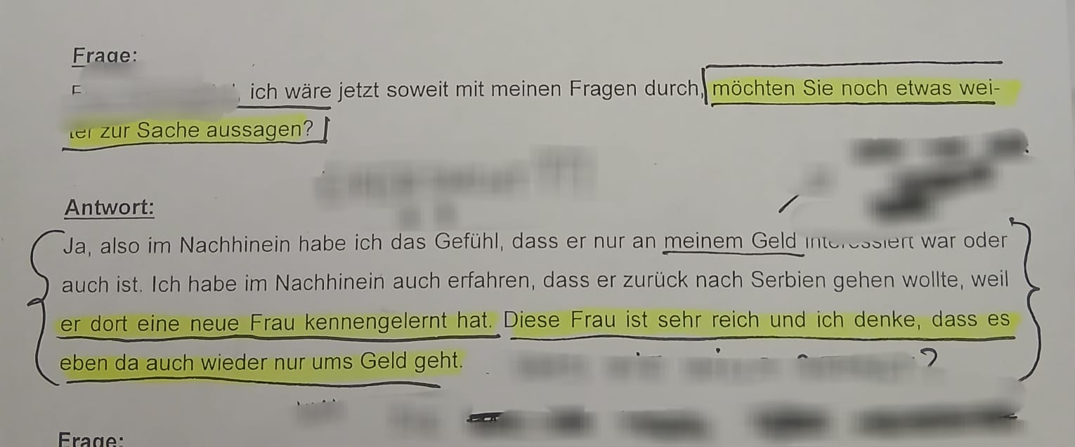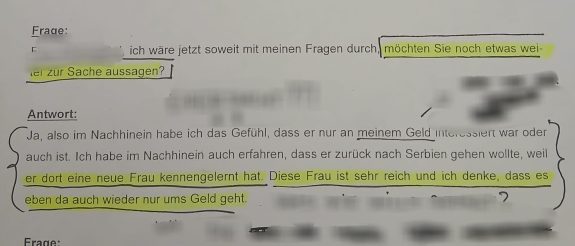 Zusätzlich spekuliert die Zeugin am Ende ihrer Aussage auf die letzte Frage hin – anstatt Angst auszudrücken – darüber, dass ich angeblich eine neue Frau kennengelernt hätte, dass sie „reich“ sei und sich „wieder alles ums Geld dreht“.