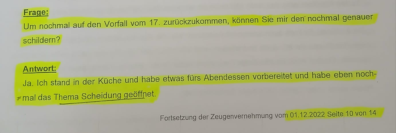 Laut dieser offiziellen Aussage war der Auslöser für den Vorfall am 17.11.2022 das Gespräch über die Scheidung, das sie während der Essensvorbereitung eröffnete.