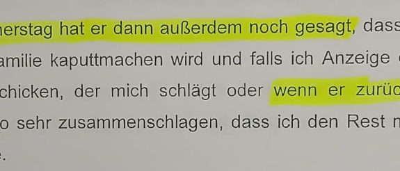 Im weiteren Verlauf bis Seite 10 werden Aussagen über körperliche Gewalt gemacht – aber das mutmaßliche Opfer behauptet, sie habe nie Blutergüsse gehabt und könne das nicht bestätigen...