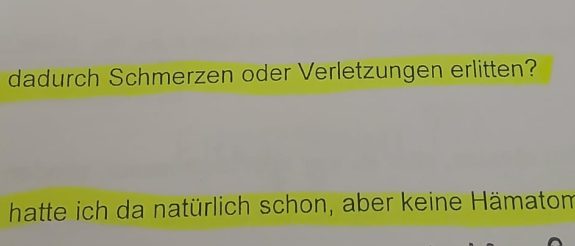 In derselben Aussage vom 1.12. auf die Frage, ob sie Schmerzen oder Verletzungen habe, antwortet sie, dass sie keine Hämatome oder Ähnliches habe, aber über Schmerzen klagt (Bild), was nicht ausreicht, um eine Anklage wegen Körperverletzung zu erheben, die offensichtlich nicht vorliegt.
